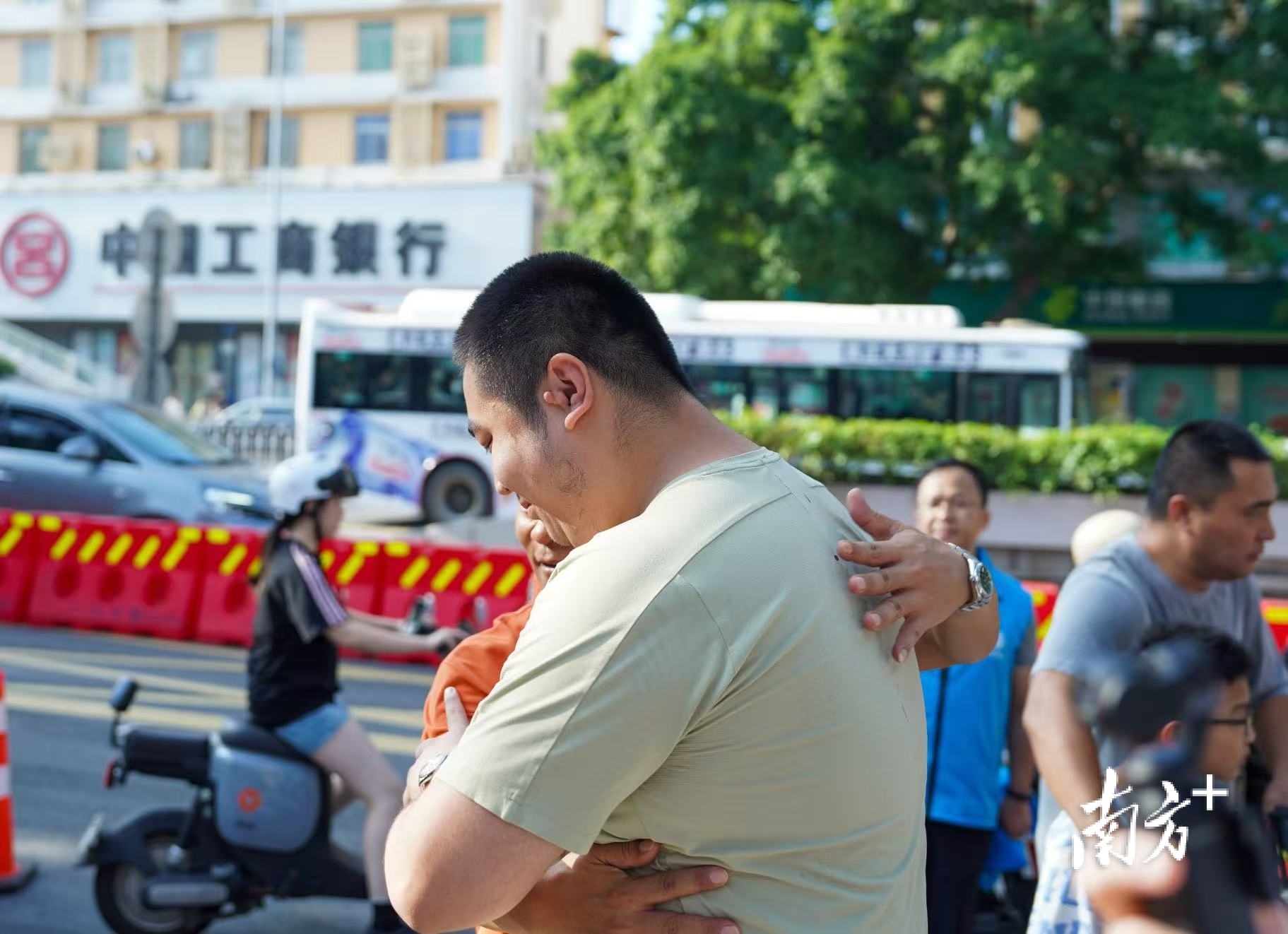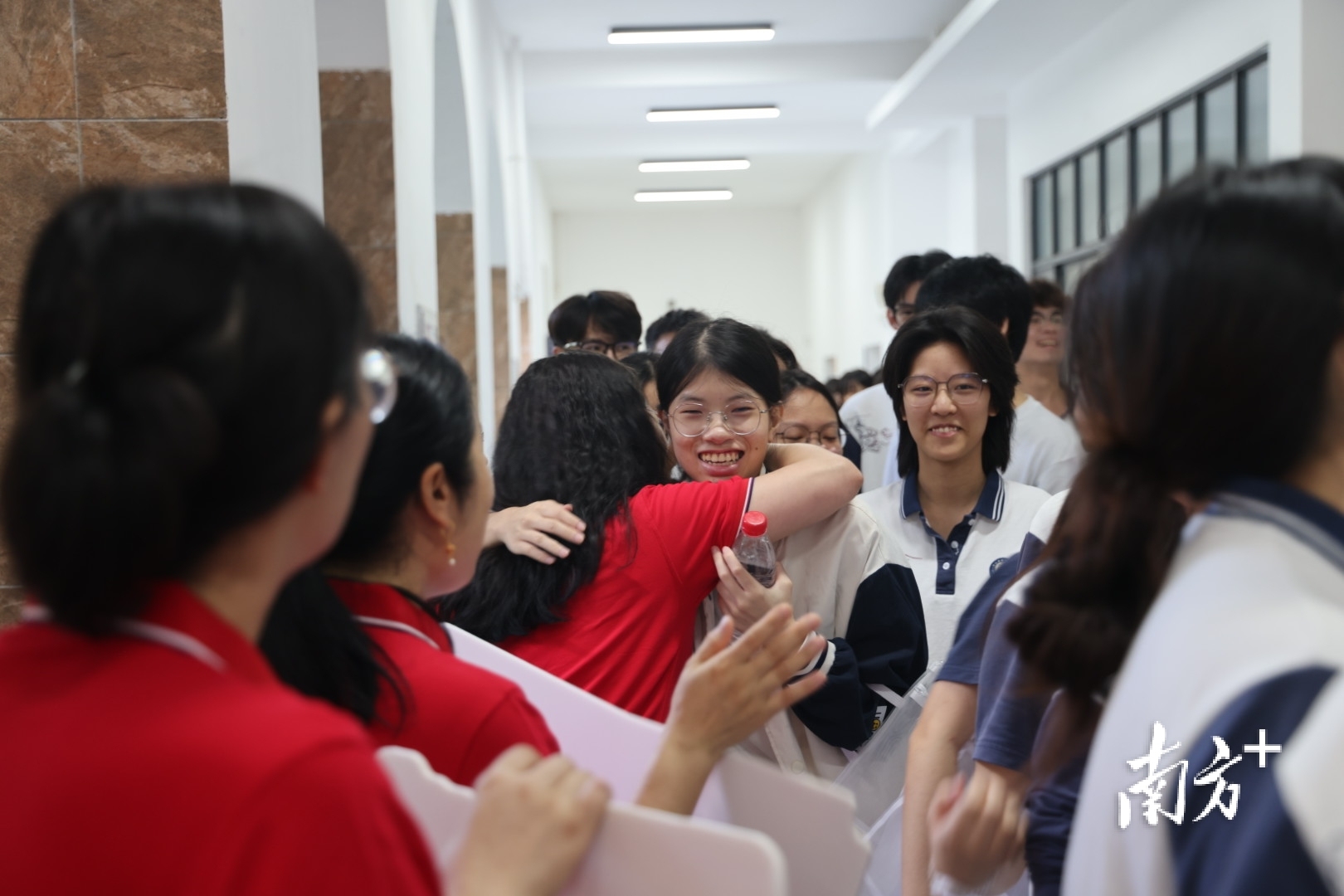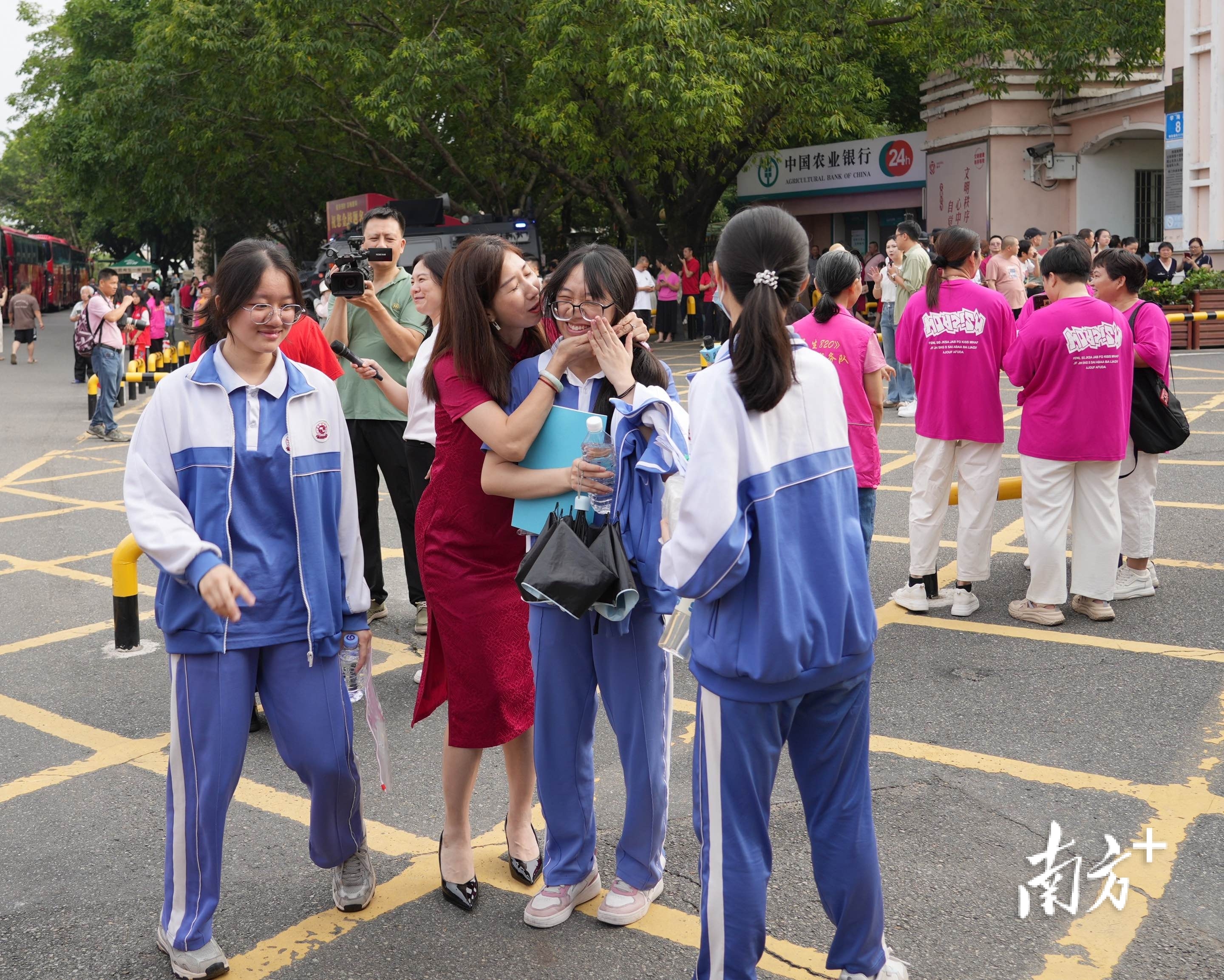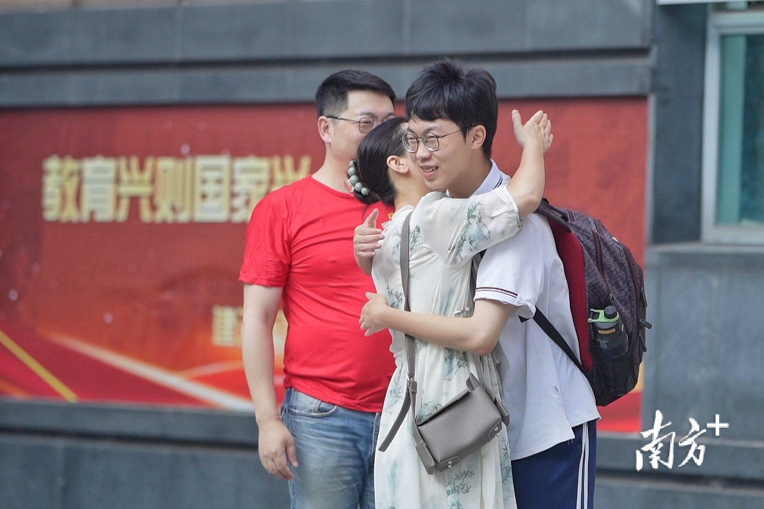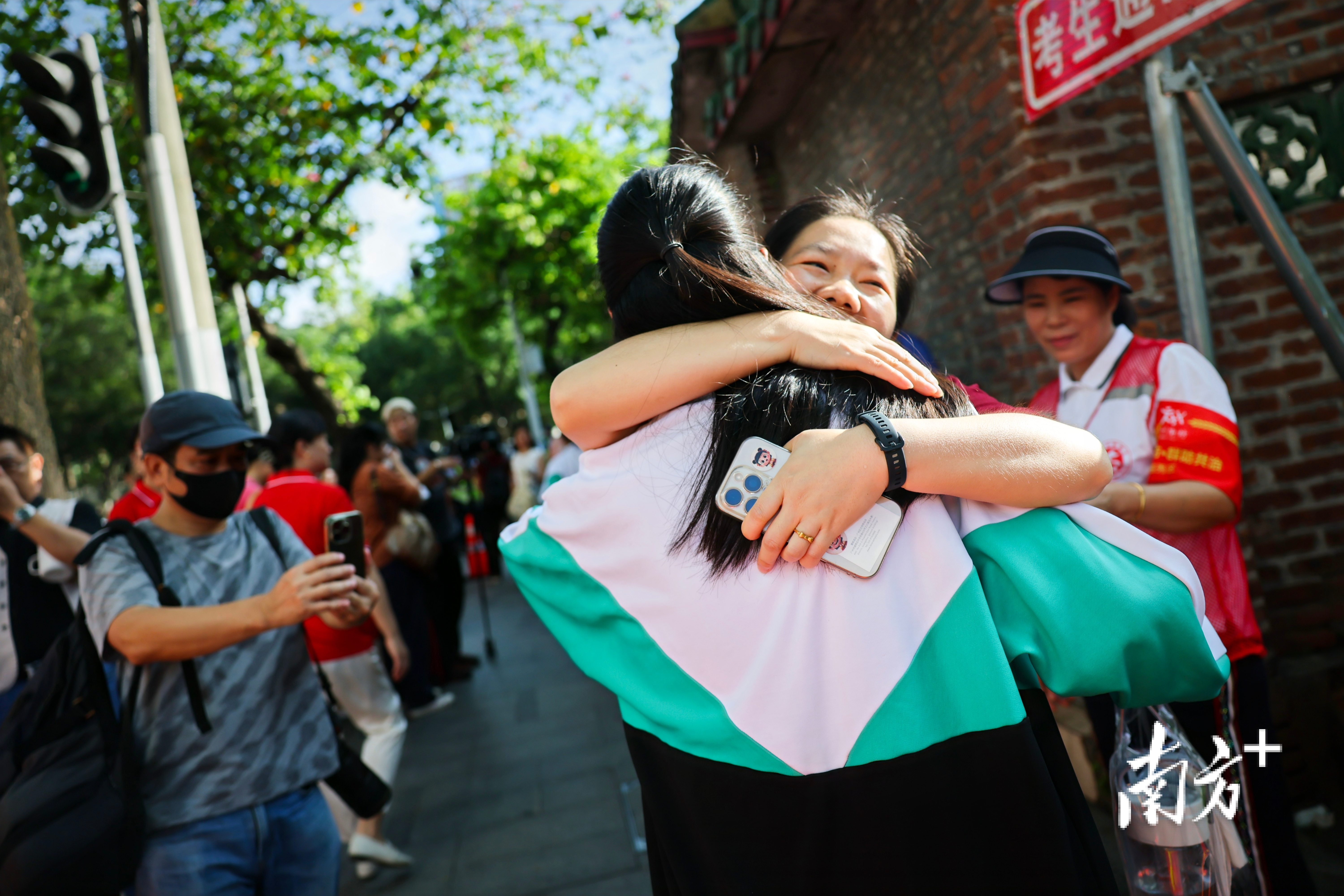 在佛山南海桂城中学考点,学生们赓续进场,送考的家长用拥抱为考生加油打气。