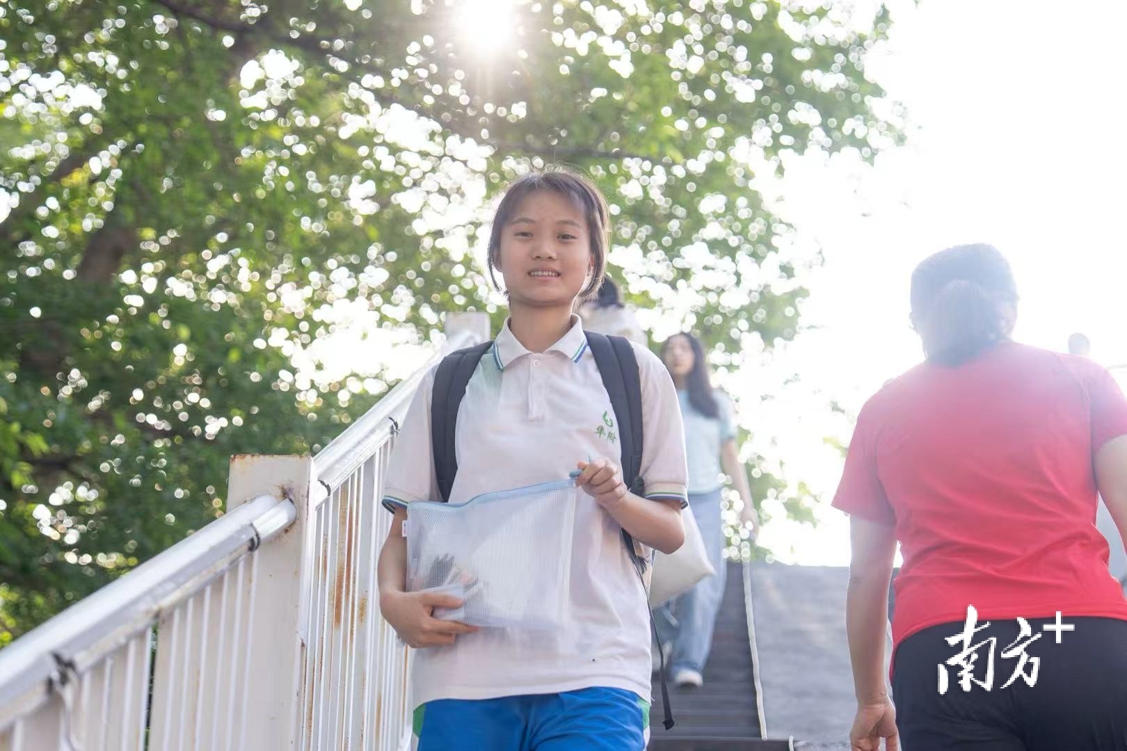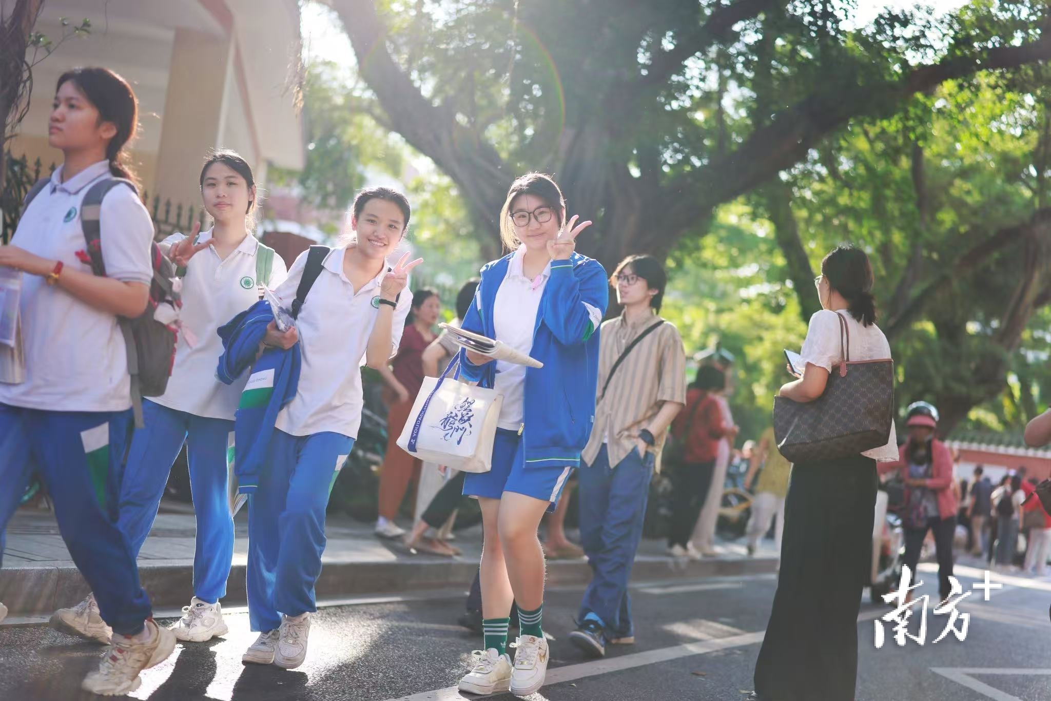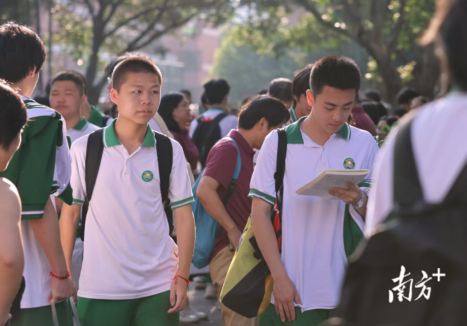 早上7时许,华南师范大学附庸中学考点,高考考生迎着阳光自信赴考。