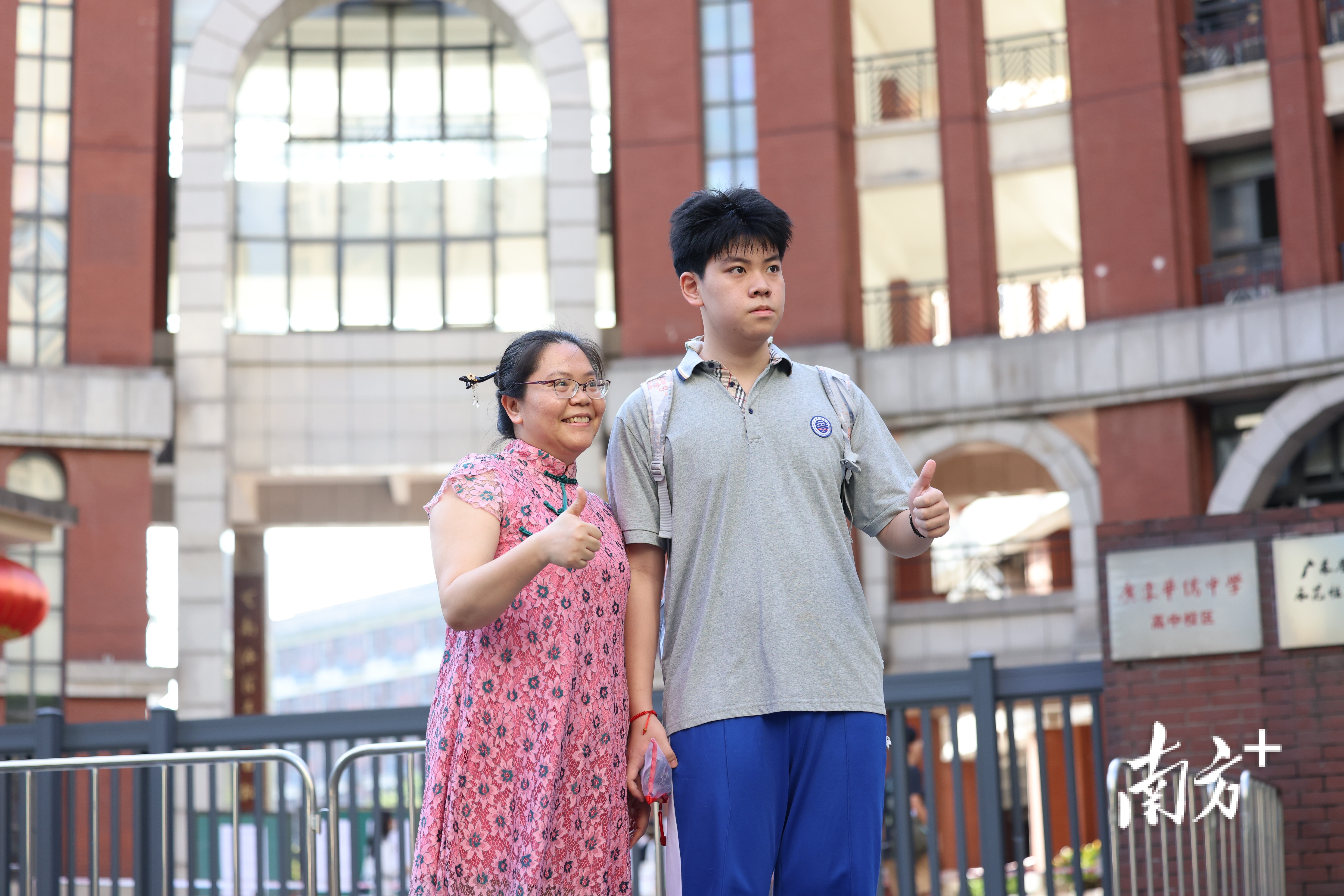 在广东华裔中学考点,小王同学入校前与姆妈合影挂牵铭记时辰。