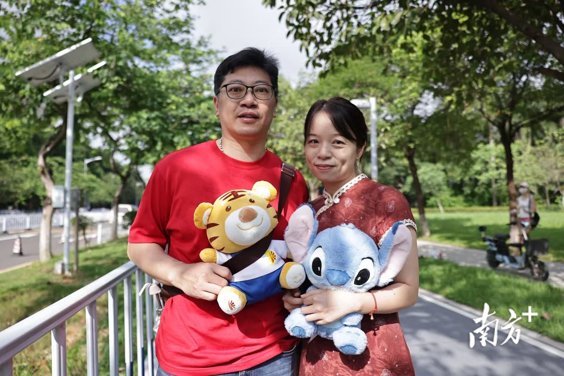 早上9时许,弘大附中考点门口,考生家长郑先生和周女士带着儿子的两个玩偶前来送考。