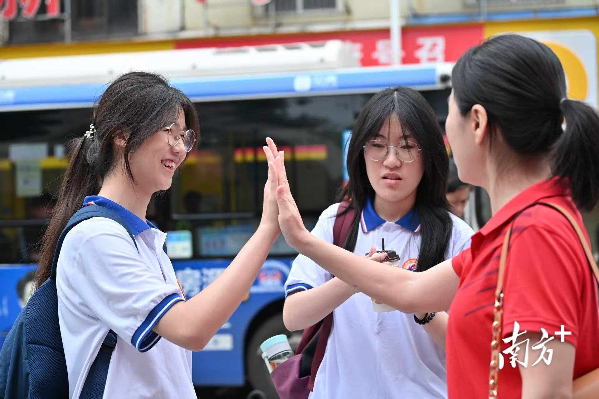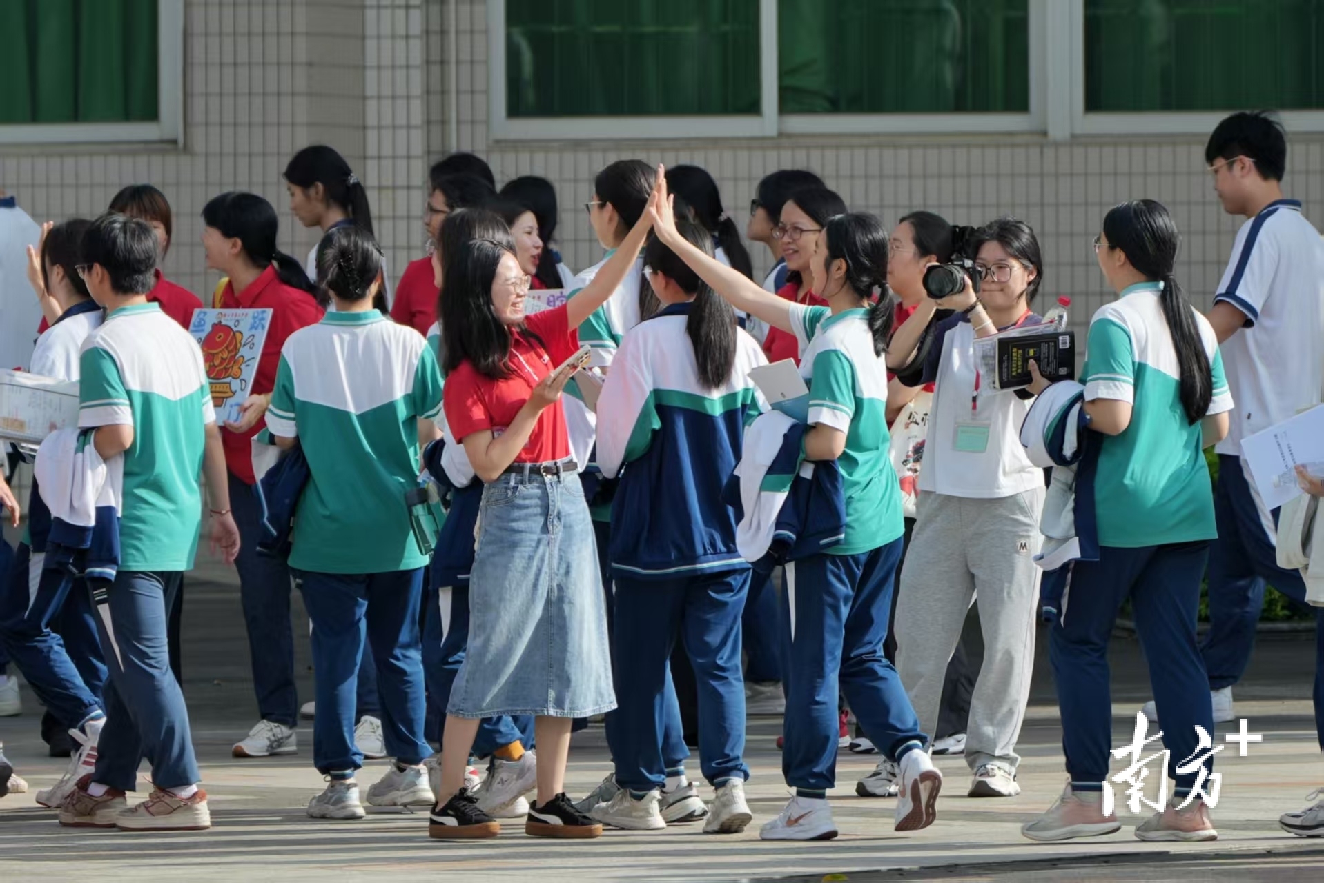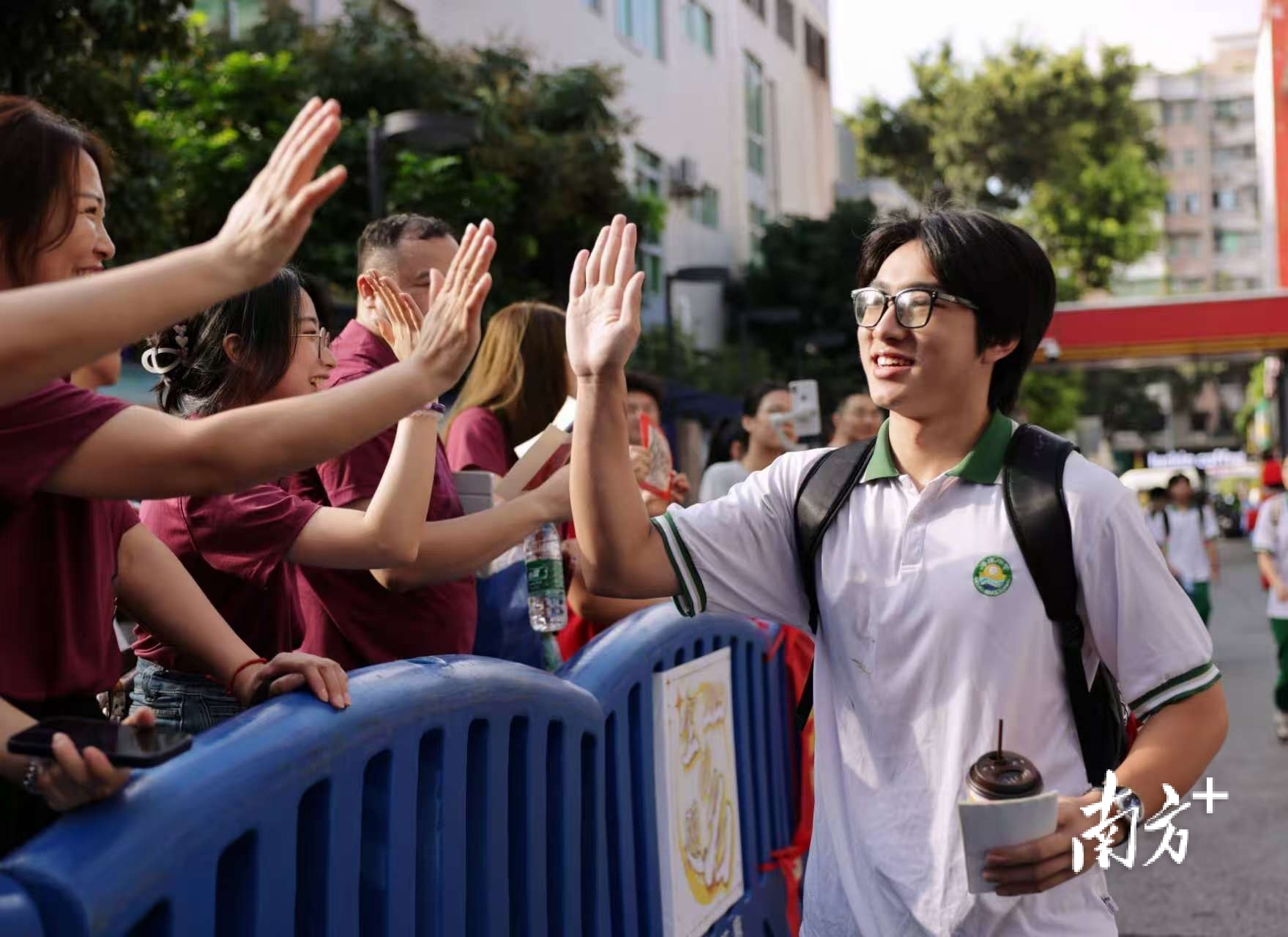 在佛山市第三中学考点,老诚与同学们击掌,为他们加油饱读劲。
