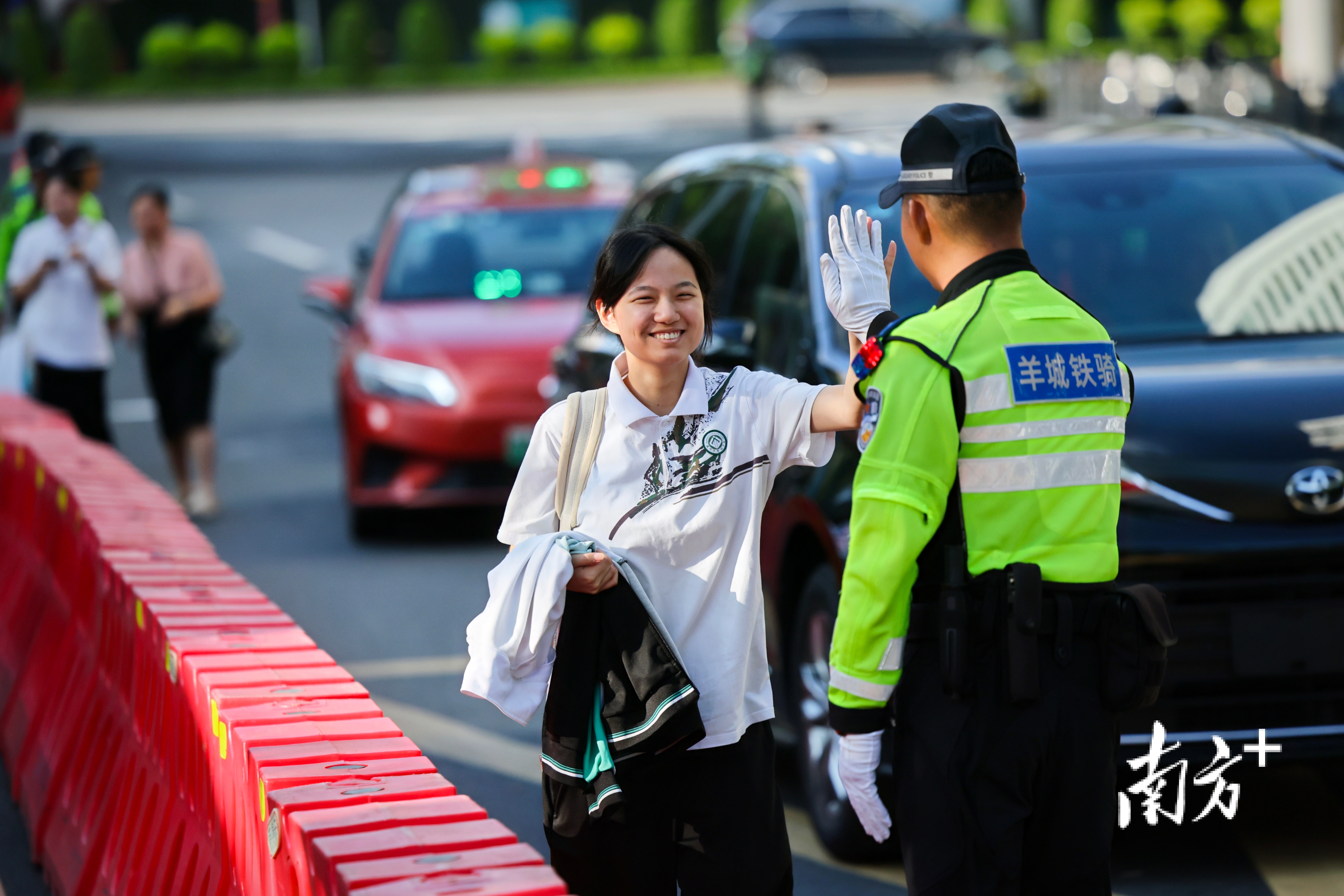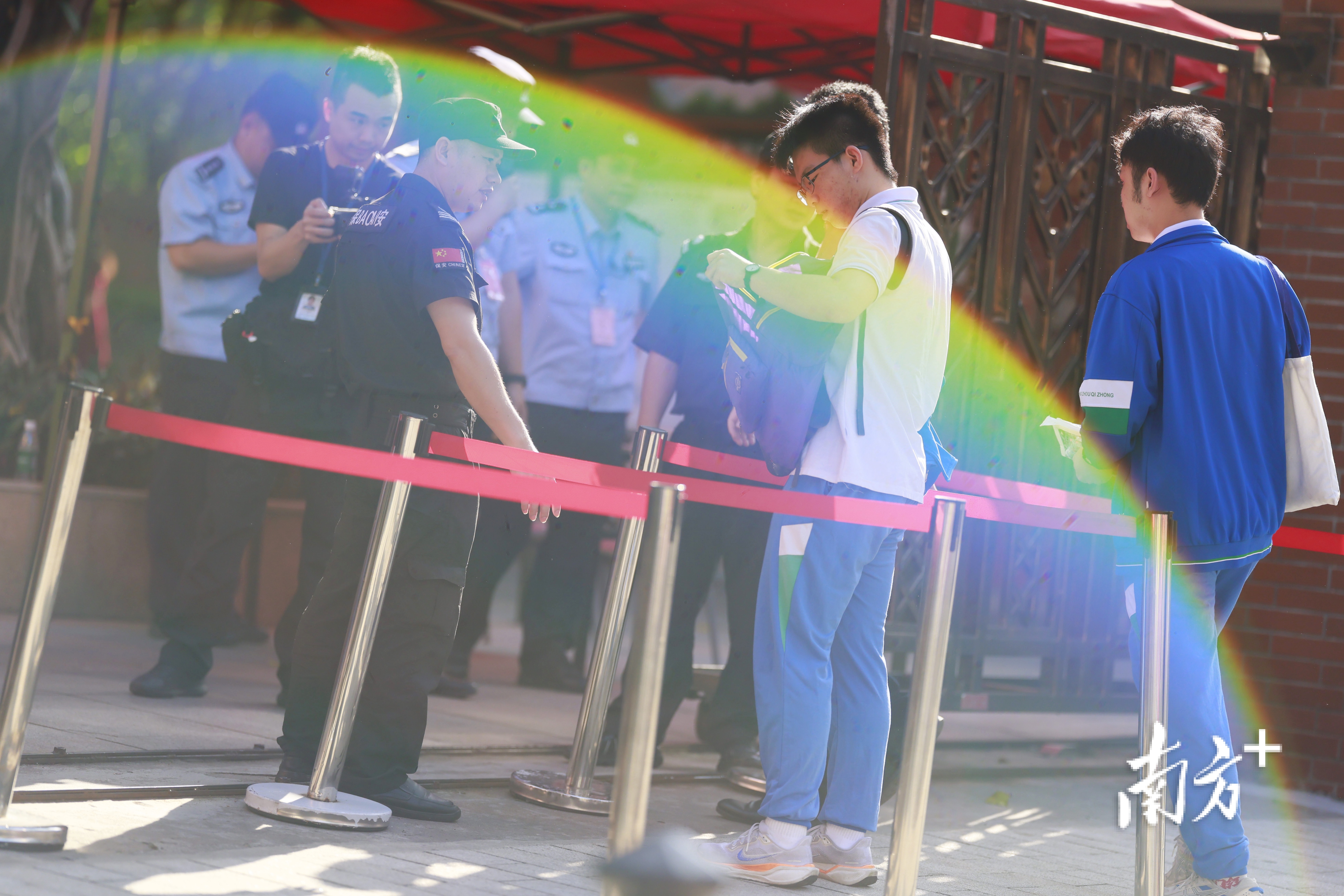 广州七中、培正中学考点,踏入八点整,考生赓续走进科场,一起禁止收到送考师长亲一又的祝贺。