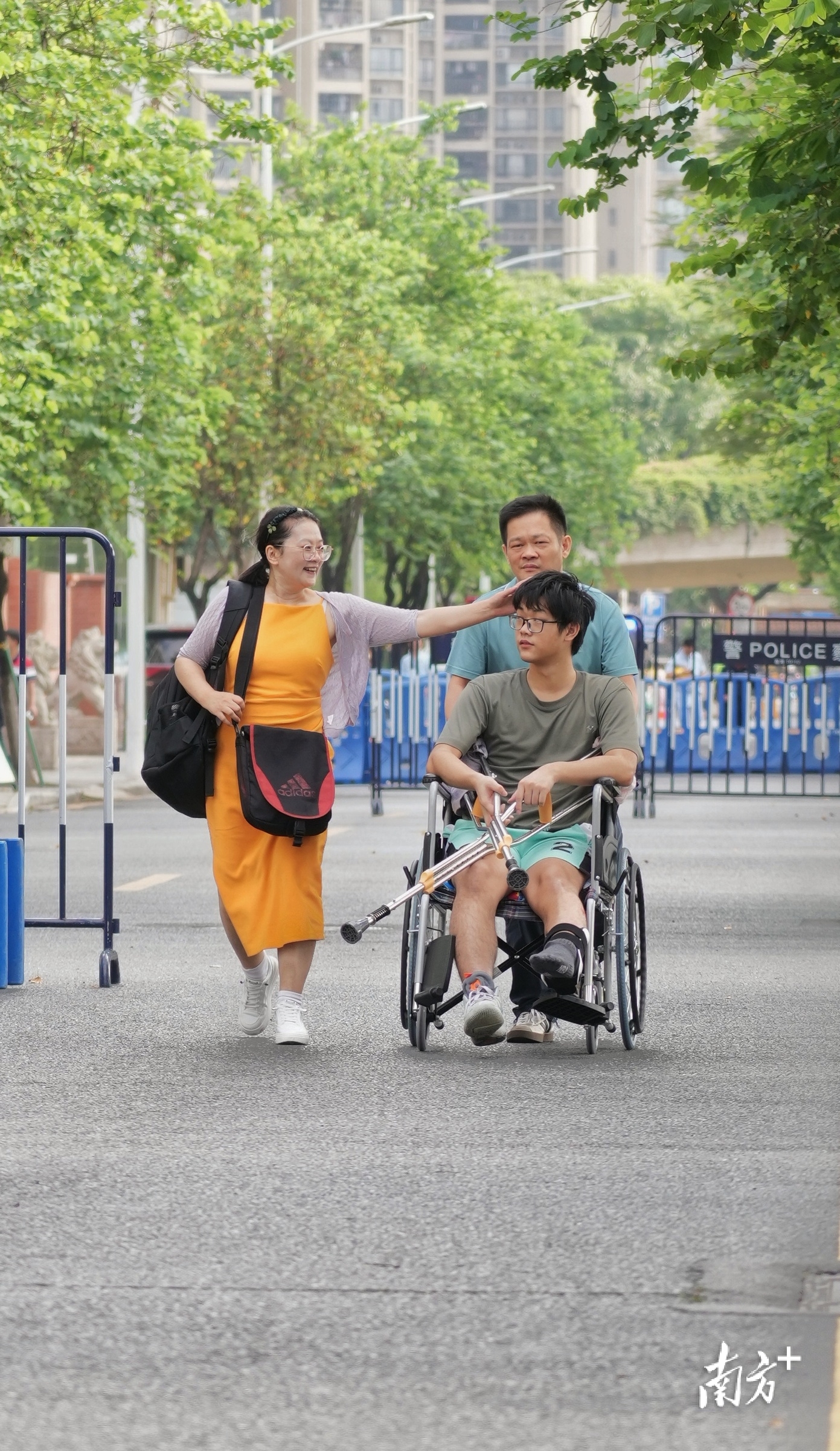 早上8点,一位坐轮椅的考生在家长追随下走进广东施行中学科场。