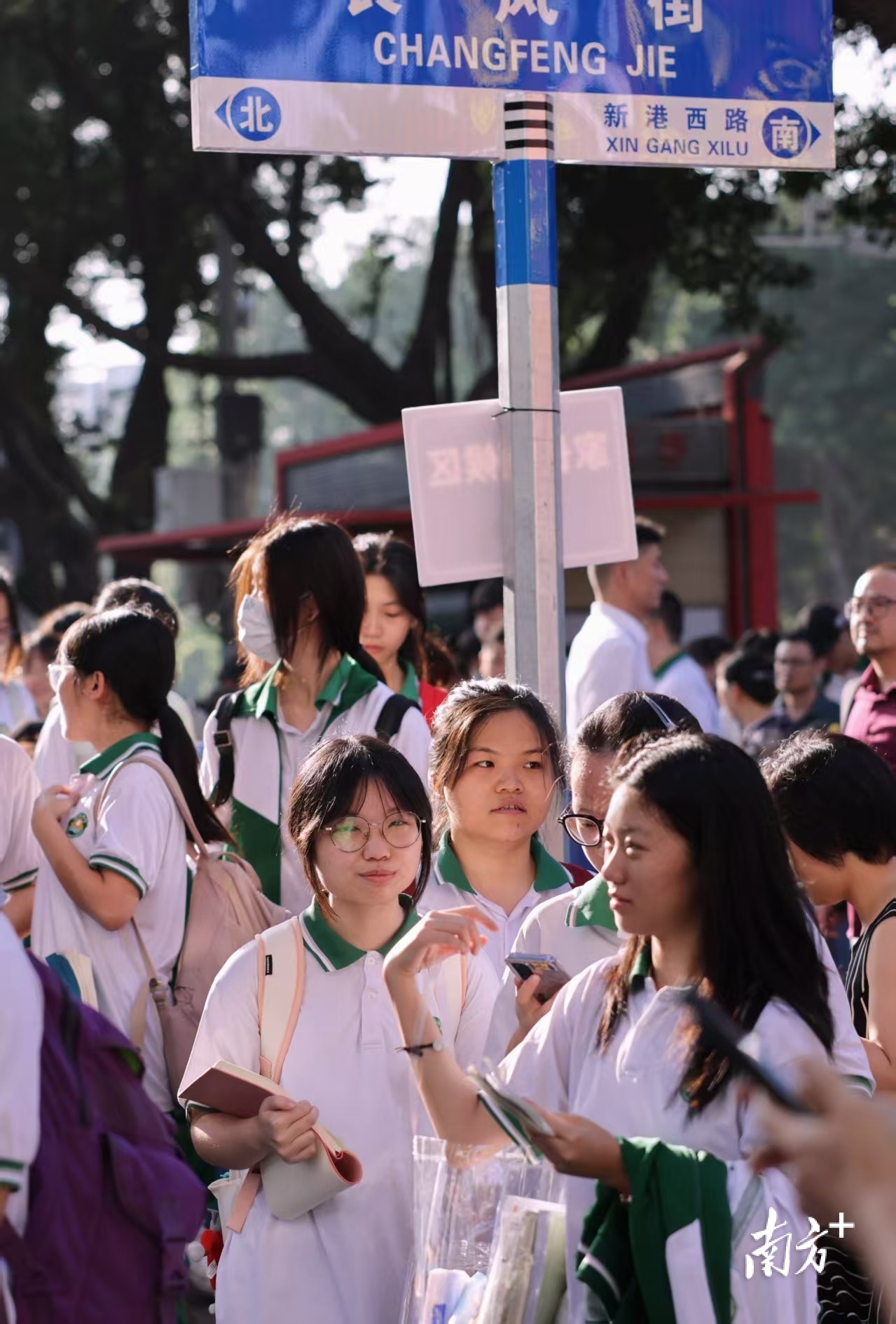 早上7时许,广州市第六中学门前,向阳下陆赓续续有参加高考的学生来到校外等候走进科场。