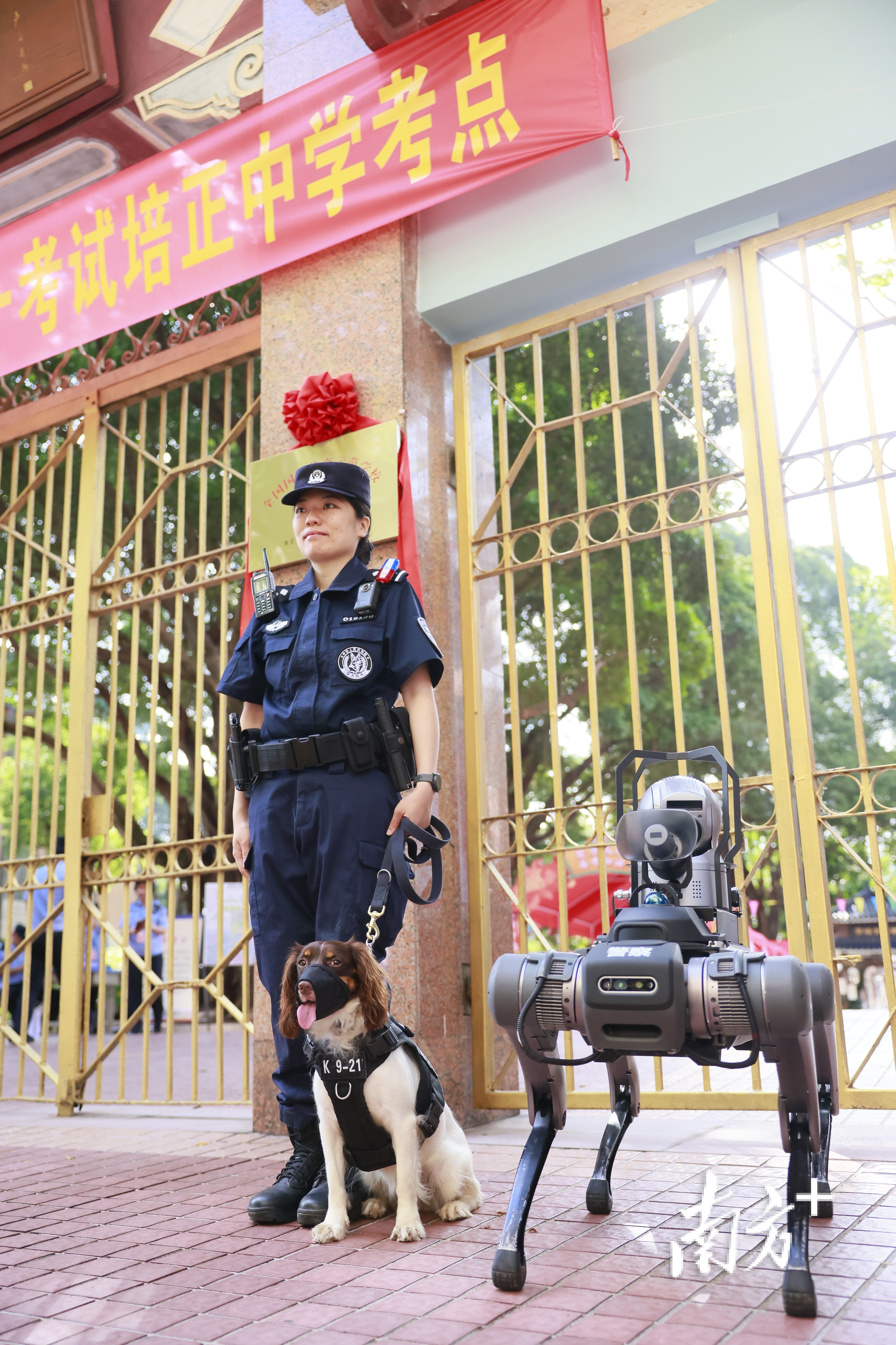 广州培正中学考点,机器东说念主“警犬”与警犬一同上岗。