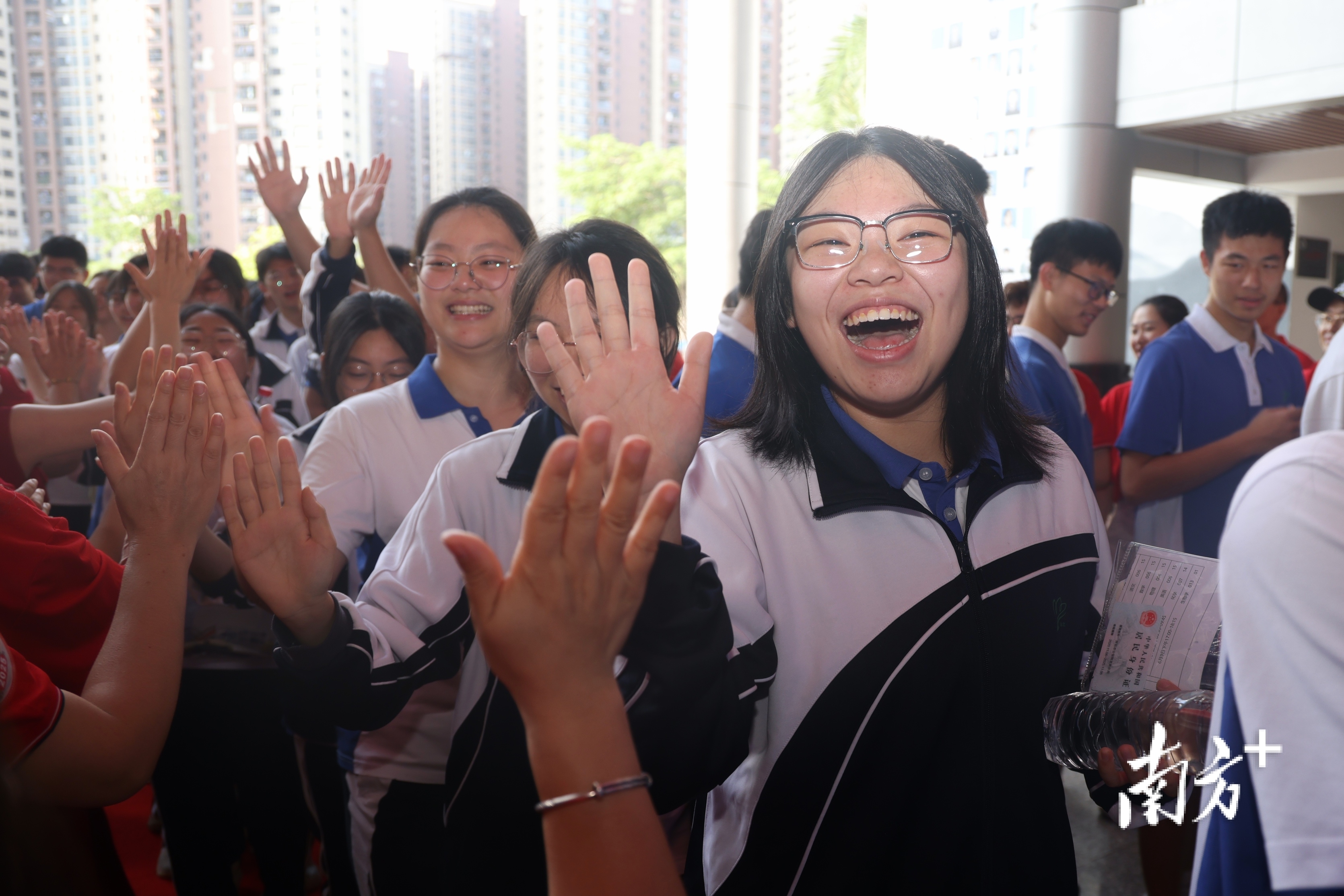 在深圳市坪山高等中学考点,考目生两队走红地毯,与老诚挥手击掌后,在浓烈氛围中步入科场。