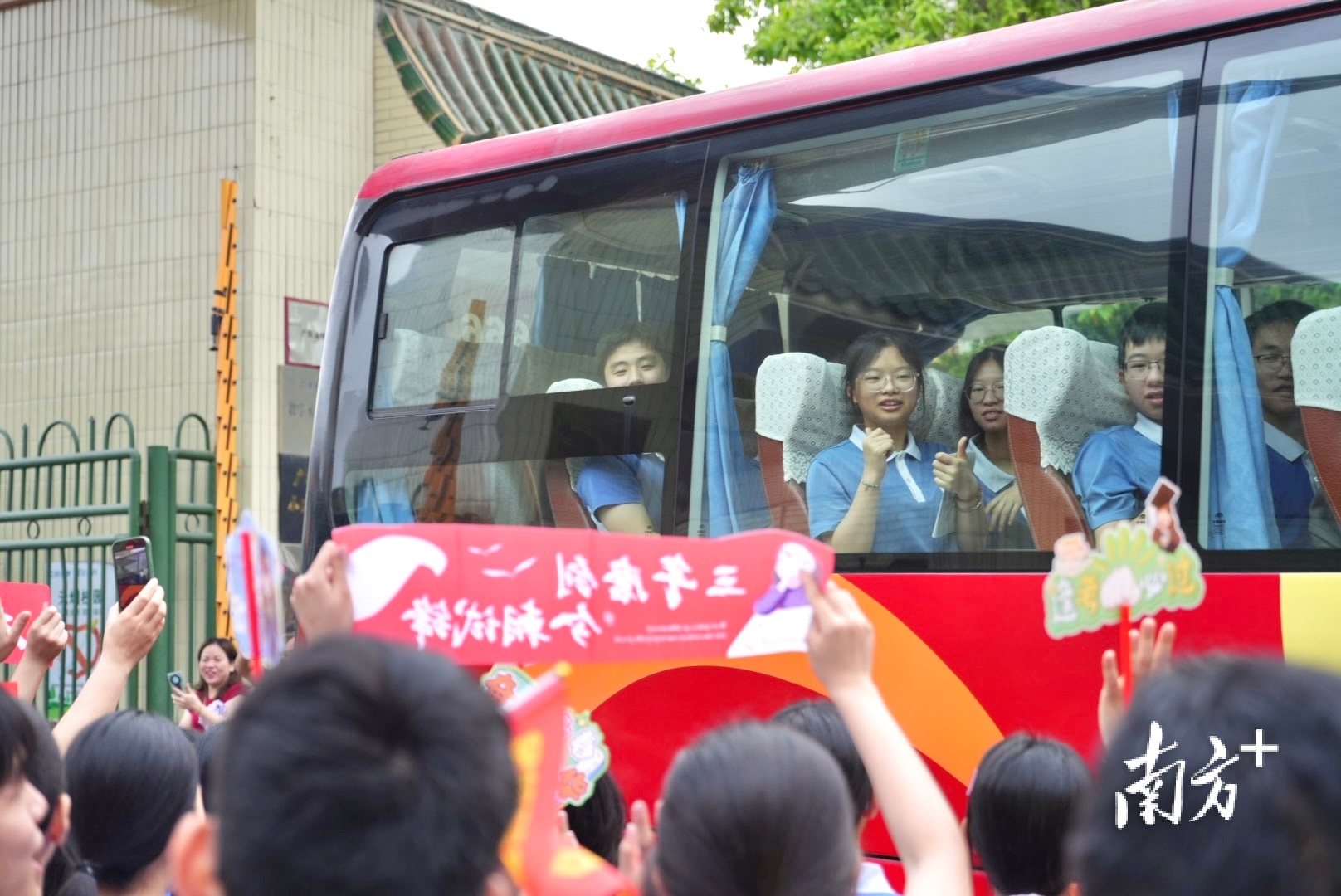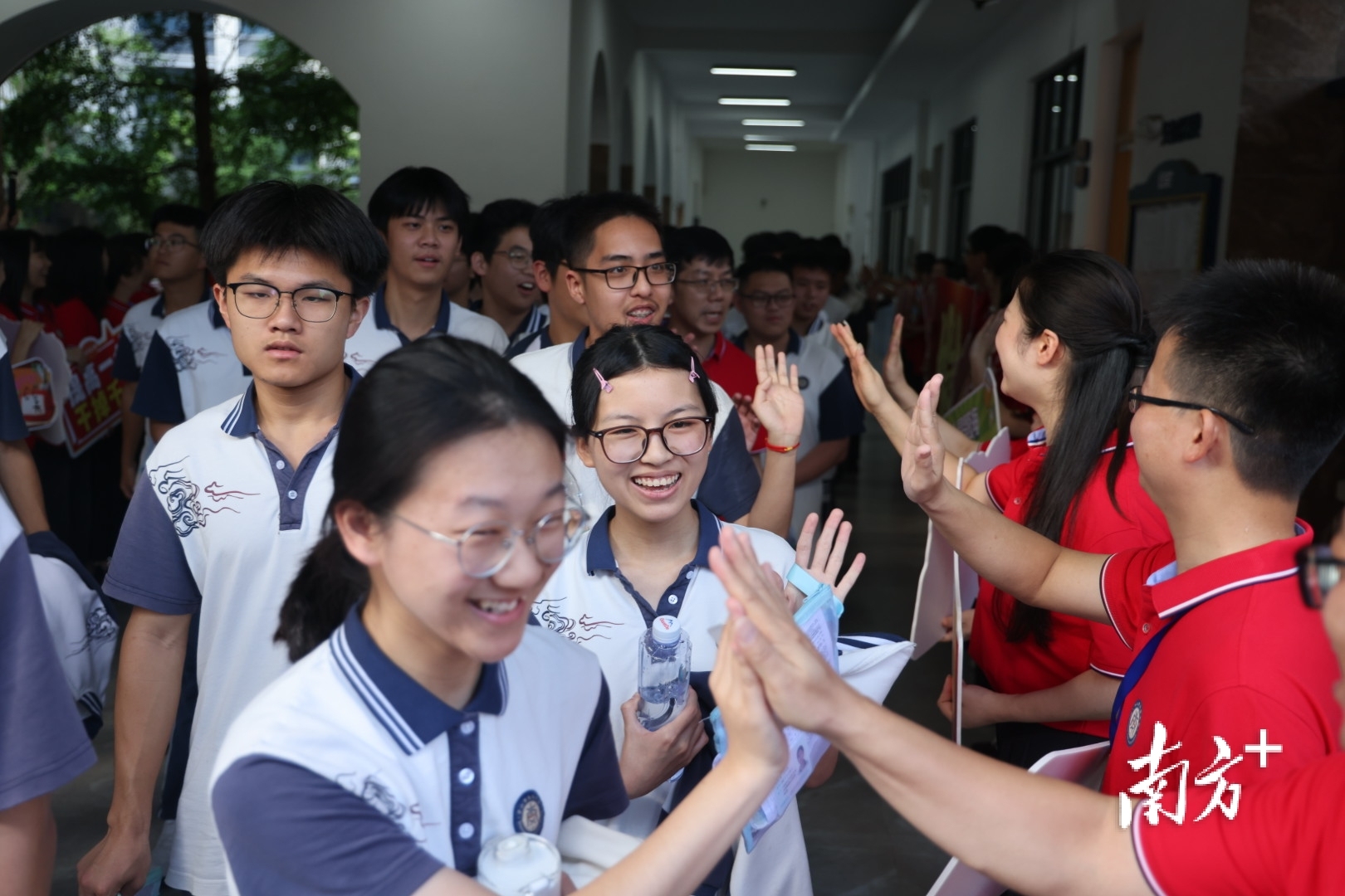 6月7日上昼,在中山市永安中学考点,高三的老诚身穿红穿着与考生轮替击掌,为首届1100余名高三学子送考。