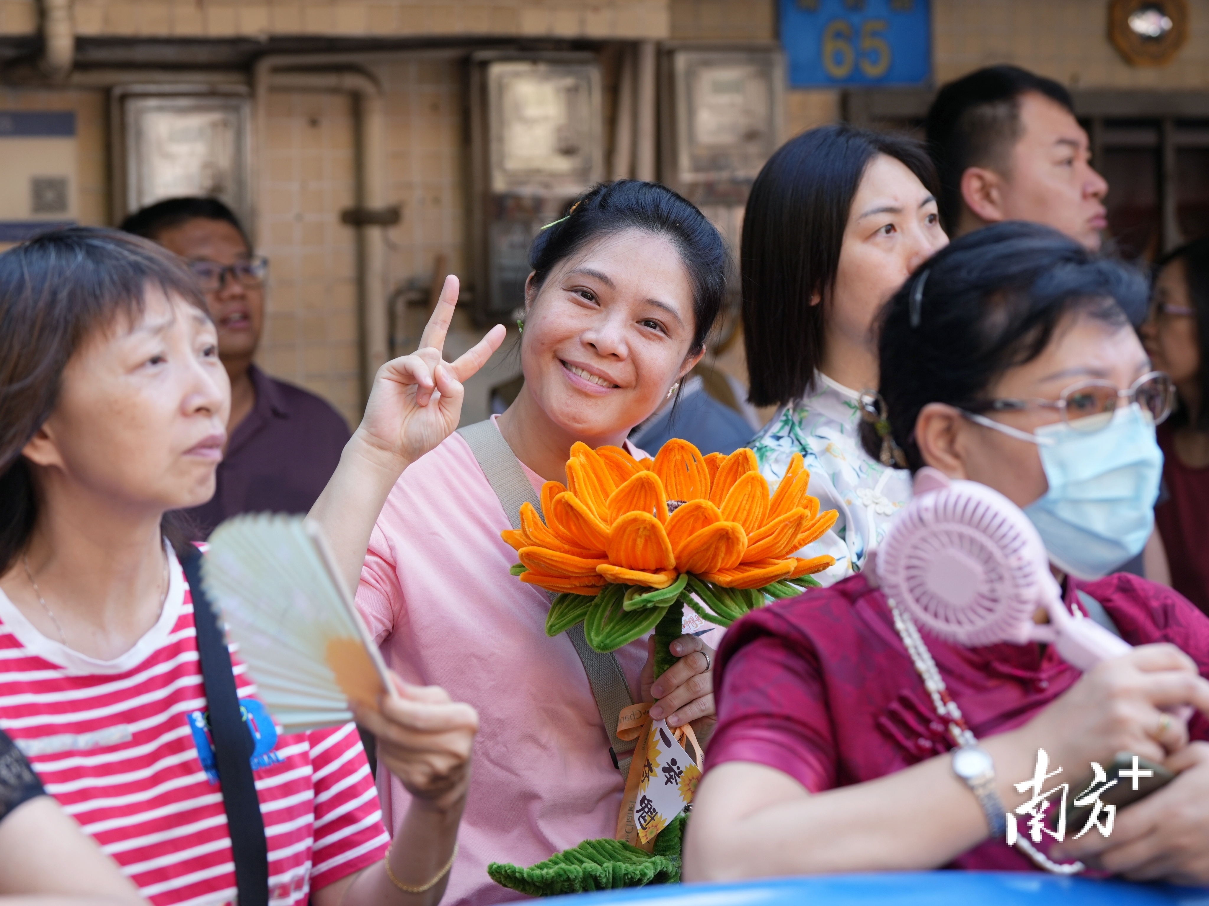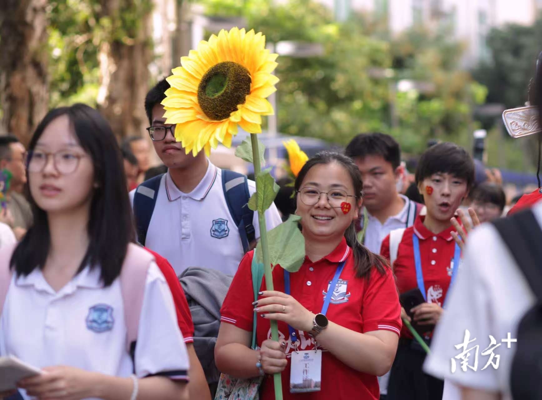 在广州市第五中学考点,送考家长手工制作的葵花,在东说念主群中相配详确。